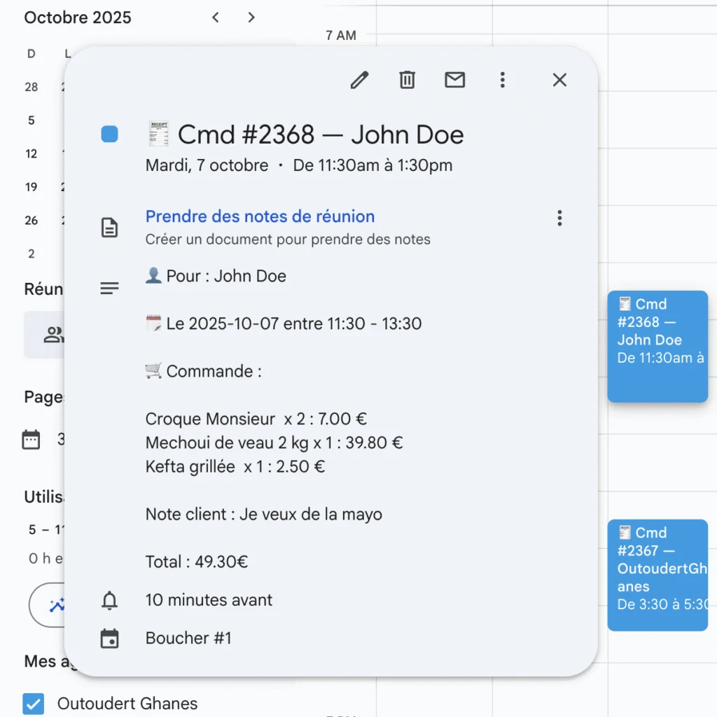 Les fiches produits sont synchronisées automatiquement avec Google Sheets grâce à Make.com : les mises à jour de prix, poids et stocks sont reflétées instantanément sur le site, toutes les nouvelles commandes sont visibles et notifiées sur Google Agenda pour éviter tout oubli aux équipes et leur permettre une organisation infaillible.